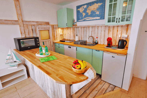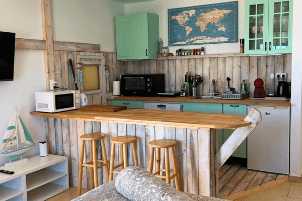 - Eine voll ausgestattete Küche mit Herd, Mikrowelle, Kühlschrank mit Gefrierfach, Spülmaschine und allen wichtigen Utensilien für die Selbstverpflegung