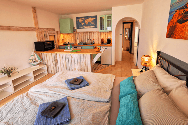 - Ein Wohn-/Schlafzimmer mit Meerblick, das mit einem weiteren Doppelbett ausgestattet ist – perfekt für entspanntes Wohnen mit viel Platz